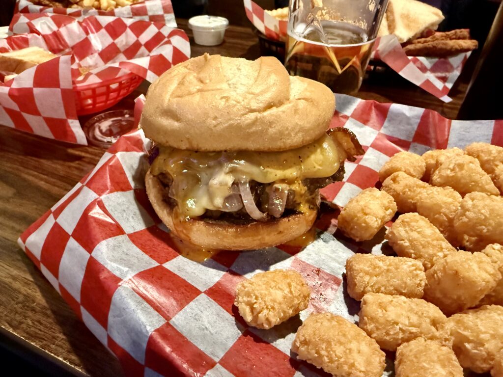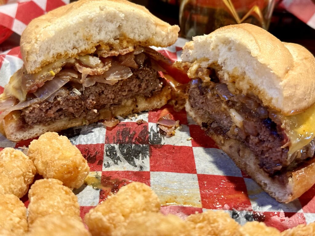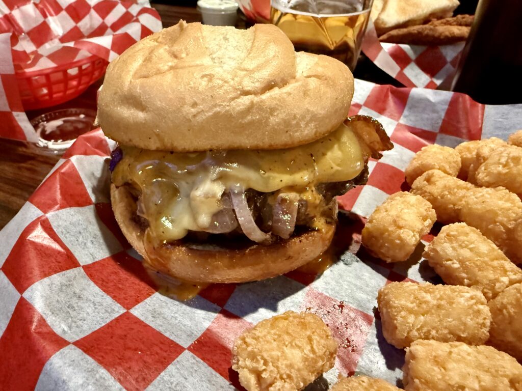The Round About A Gouda burger from Cloud 9 starts with a half-pound hand-pattied burger, then topped with huge chunks of caramelized onions, brown sugar bacon, smoked gouda cheese, and Alabama white sauce.