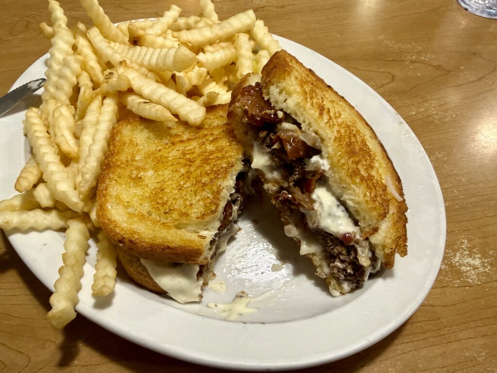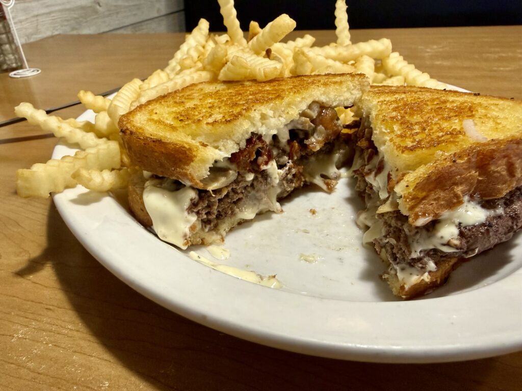 The Prairie Melt from The Wheel Inn has a 1/4 pound burger topped with mushrooms, Swiss cheese, bacon, caramelized onions, and garlic aioli. Sandwiched between seasoned grilled sourdough toast.