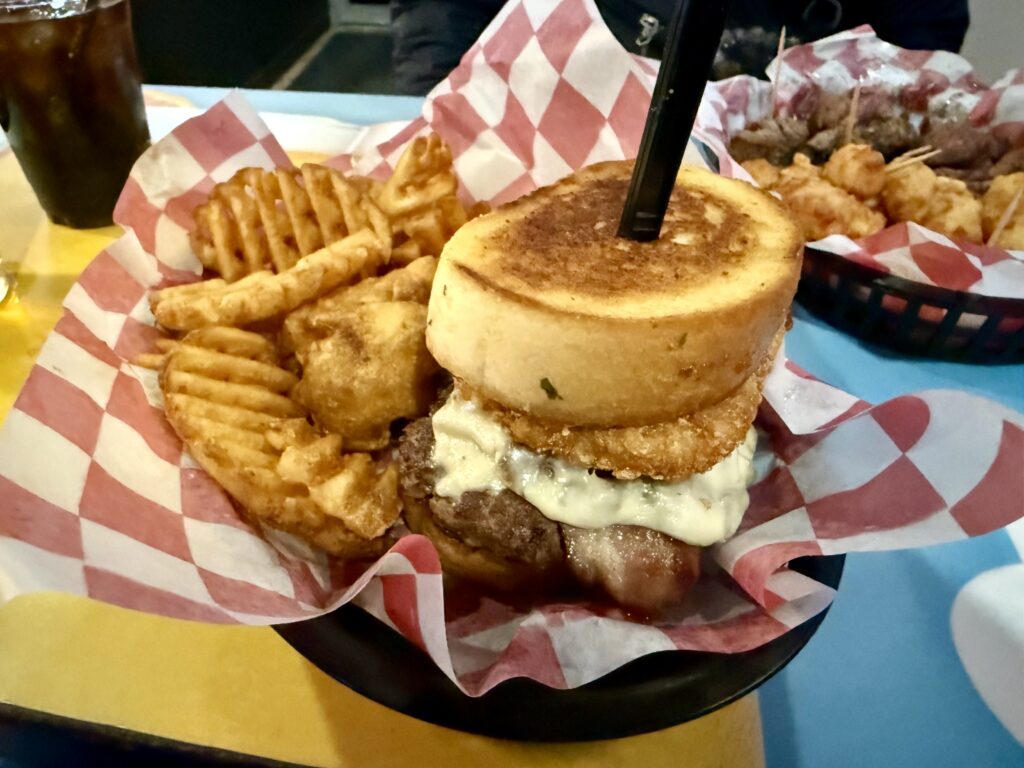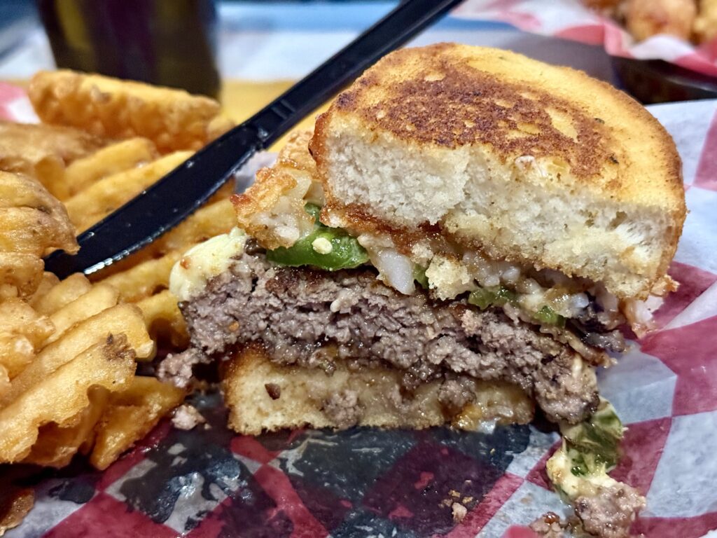 Unhinge your jaw for this sandwich. Stacked high on garlic toast is a burger patty with raspberry jalapeno jam, mushrooms, sautéed jalapenos, bacon, and a hashbrown.